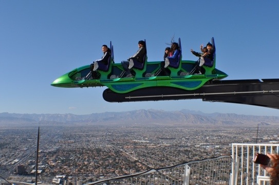 Därifrån hade vi en vidunderlig utsikt över hela Las Vegas. Vi nöjde oss med utsikten, men annars fanns det många aktiviteter, som att slänga sig ut i ett bungyjump eller åka med en vagn som i full fart körde utanför tornet, så om inte bromsarna hade fungerat vete gudarna var man hade hamnat.
