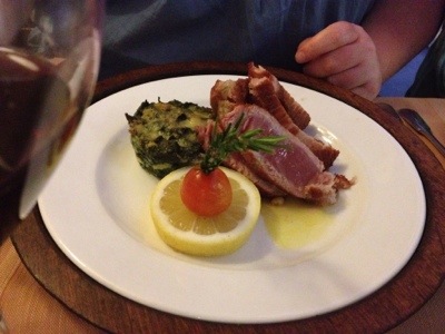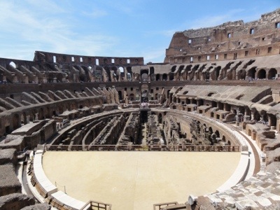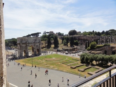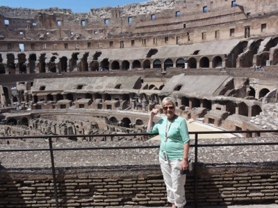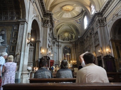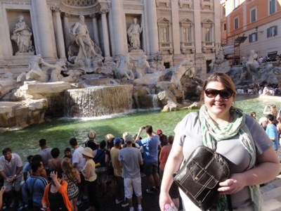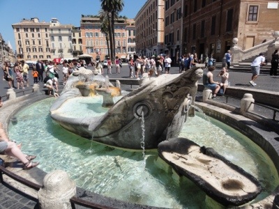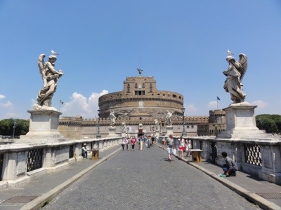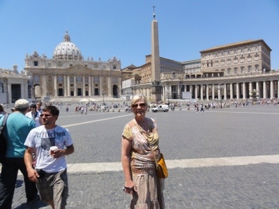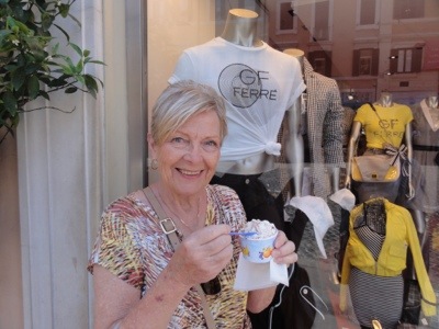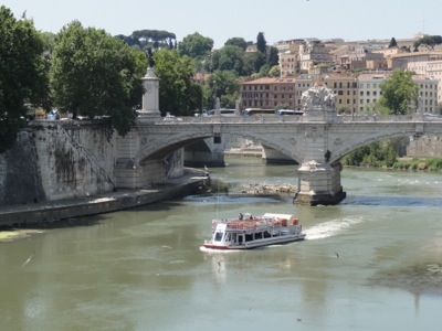 Efter besöket hos påven gick vi förbi Castello San Angelo, över floden Tibern till gamla stan, där vi åt en lättare lunch på en uteservering. Tänkte därefter sätta oss en stund vid Fontana di Trevi och äta en glass. Glassen köpte vi, men det fanns inte en enda plats att sätta sig på och ingen skugga, så vi satte oss faktiskt i en sval kyrka och åt upp den innan vi gick till hotellet för att hämta bagaget och tog en bil till flygplatsen.