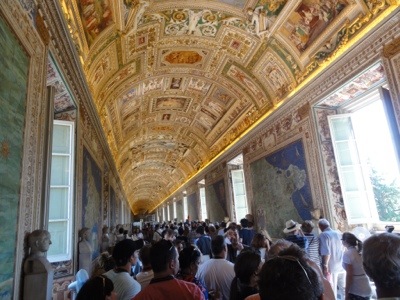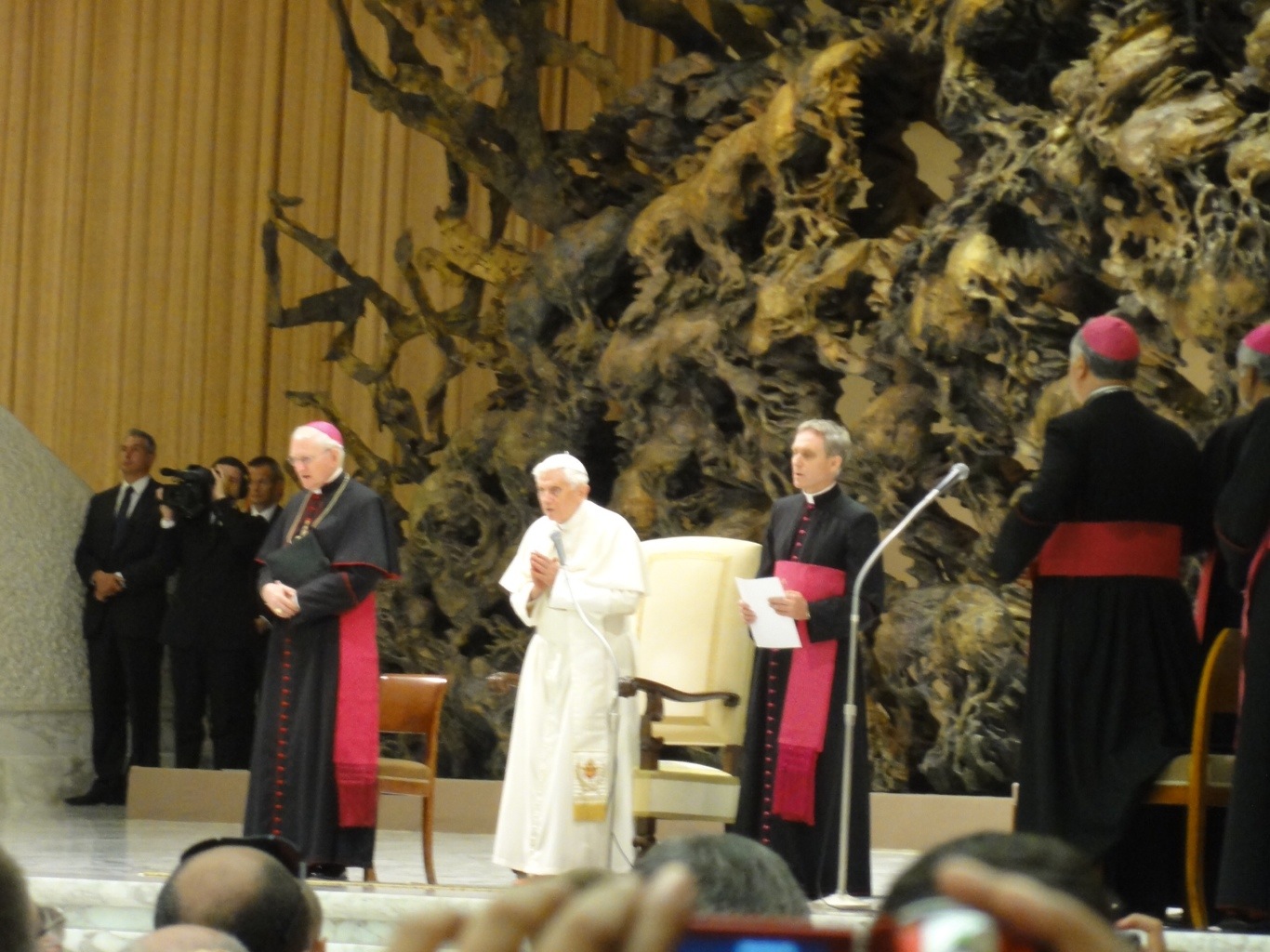 Vi fick stiga upp tidigt för vi hade fått biljetter till påvens onsdagsmottagning. Biljetterna var gratis, men man ombads att ge 5€ per person. Man blev också tillsagd att vara där i god tid, helst 2 timmar i förväg och när vi kom dit förstod vi varför. Kön var kilometerlång. För att komma in måste man igenom en poliskontroll och när vi efter en timme kom dit och jag tittade bakåt var kön fortfarande lika lång.