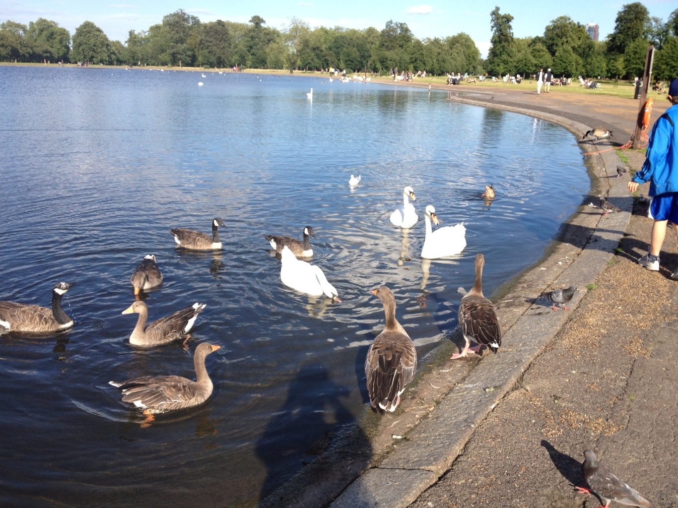 Därifrån fortsatte jag genom Kensington Garden och beundrade drottningens svanar i den lilla runda sjön. De låg så fridfullt och sov på gångbanan och brydde sig inte det minsta om alla människor som gick förbi.