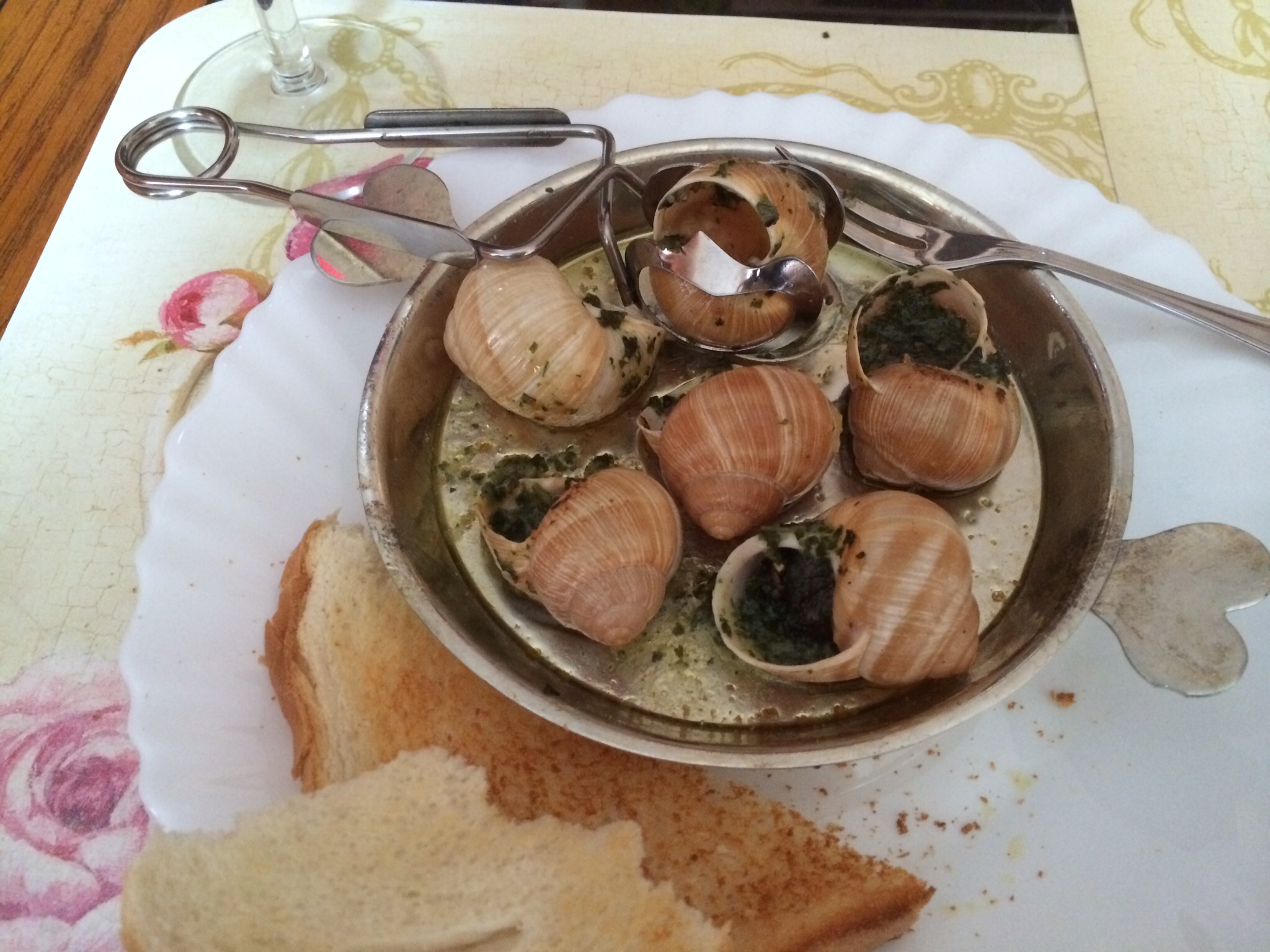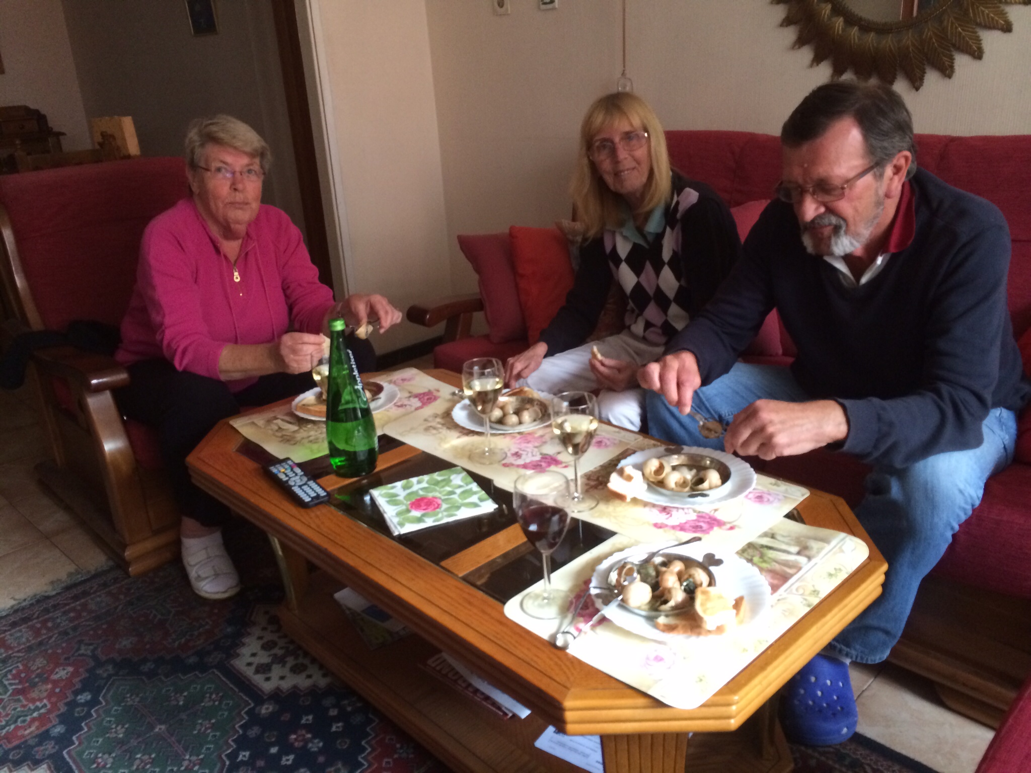 Snigelfest Idag var Ann-Margreth och jag hembjudna till Amy och Anders. Amy hade tillagat alldeles fantastiskt goda och välkryddade sniglar som avåts med rostat bröd och ett glas vin.