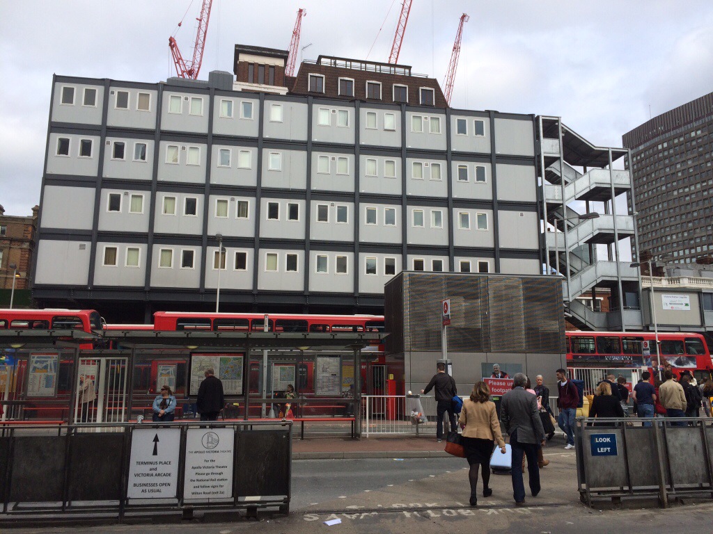 I området kring Victoria Station håller de på med enorma renoverings-arbeten. Man är ju van att se små bodar vid alla arbetsplatser, men denna i fyra våningar var imponerande.