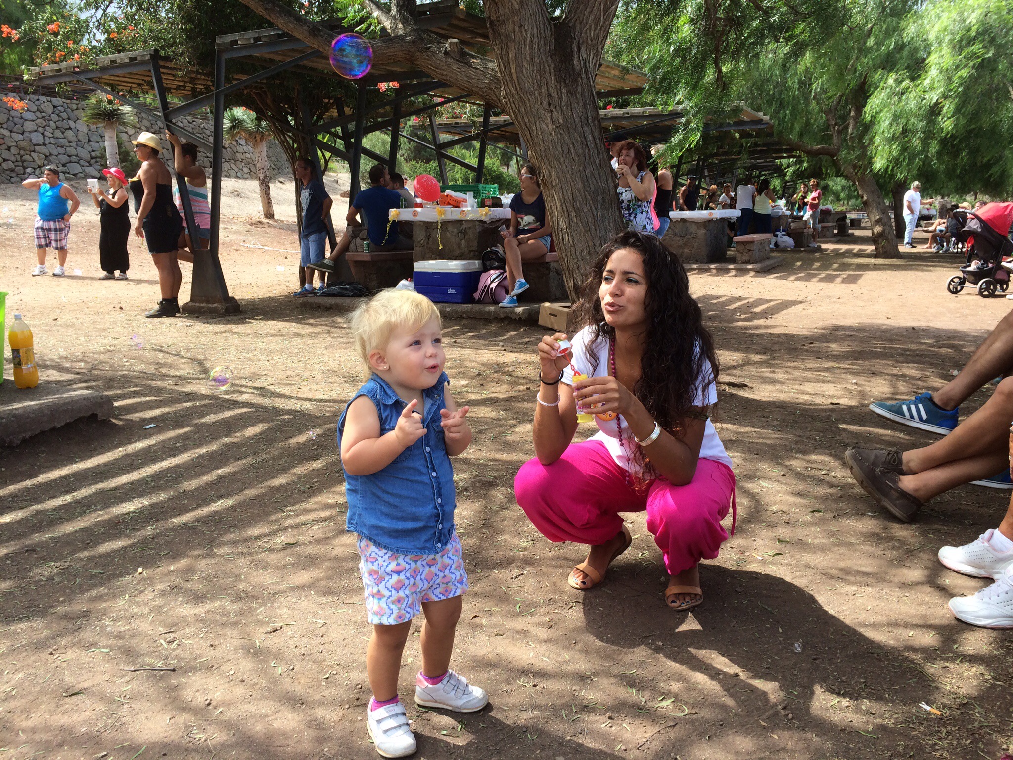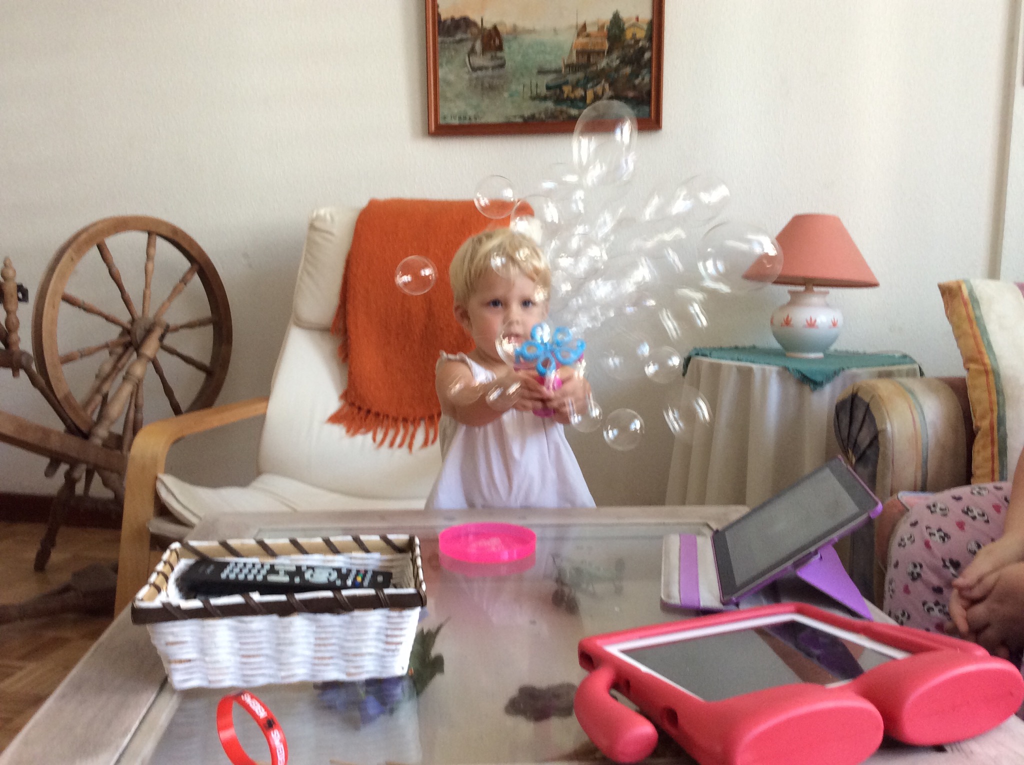 Här roar sig Daniela med att blåsa såpbubblor.