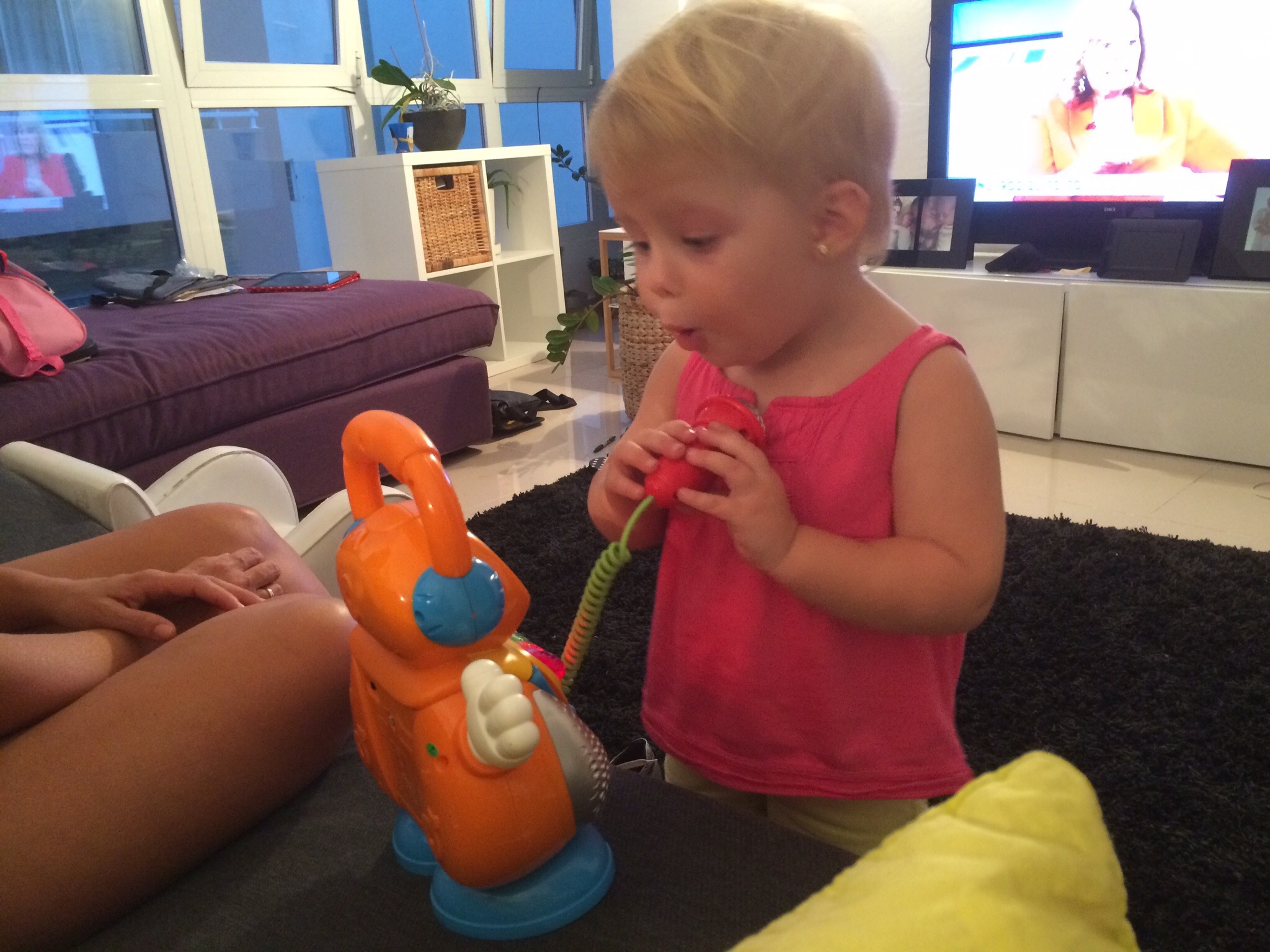 I går hjälpte jag till med att passa lillan då Desiree jobbade på Tenerife och Patrik hade jobb här på ön. Daniela älskar att sjunga och dansa. Här ser vi henne sjunga karaoke.