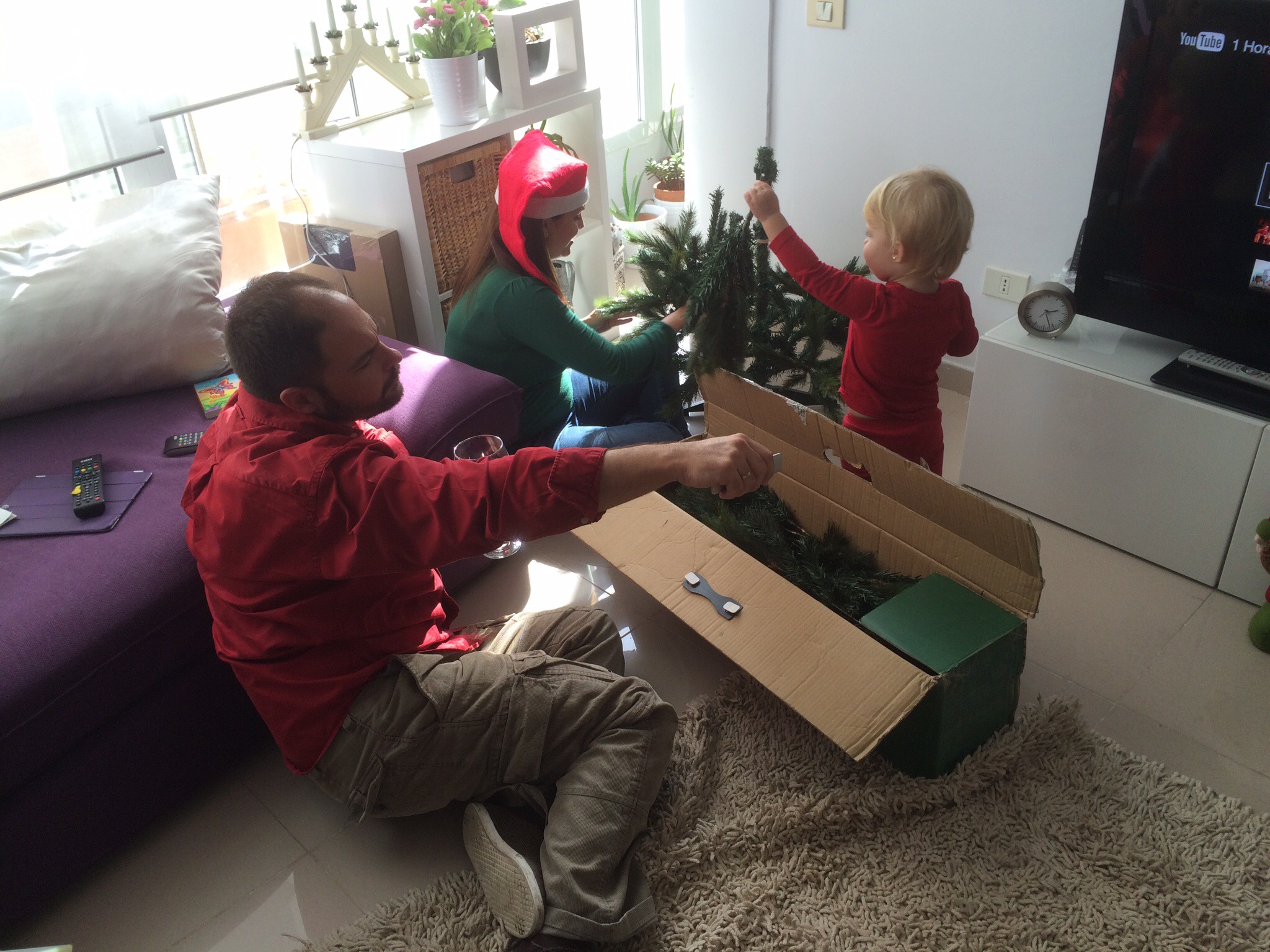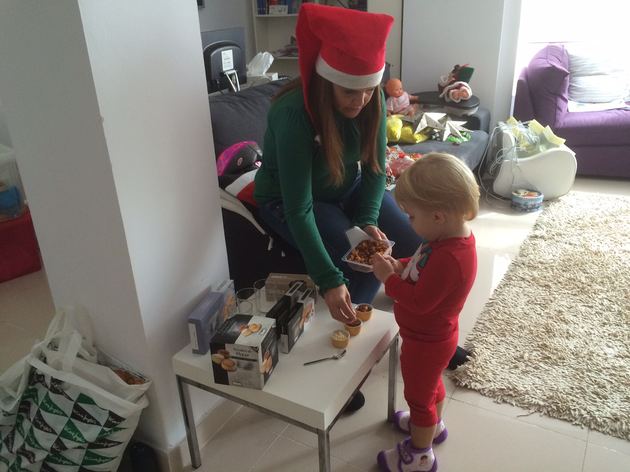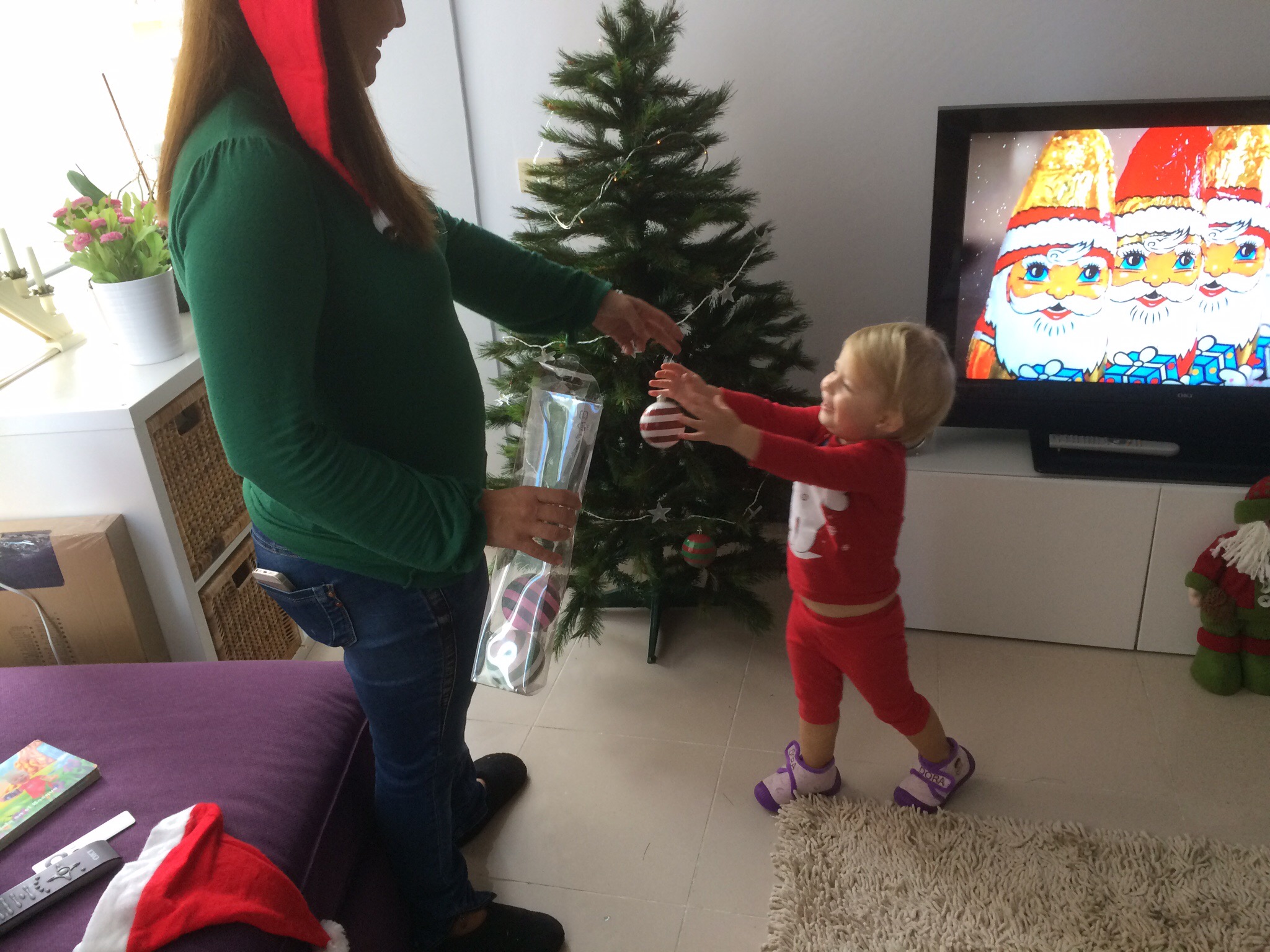 Idag vid lunchtid var jag tillbaka där hos dem för granen skulle kläs. Efter ett glas glögg serverades en god lunch och sedan var det dags att först sätta ihop den konstgjorda granen och sedan klä den, vilket Daniela gjorde med mammas hjälp.
