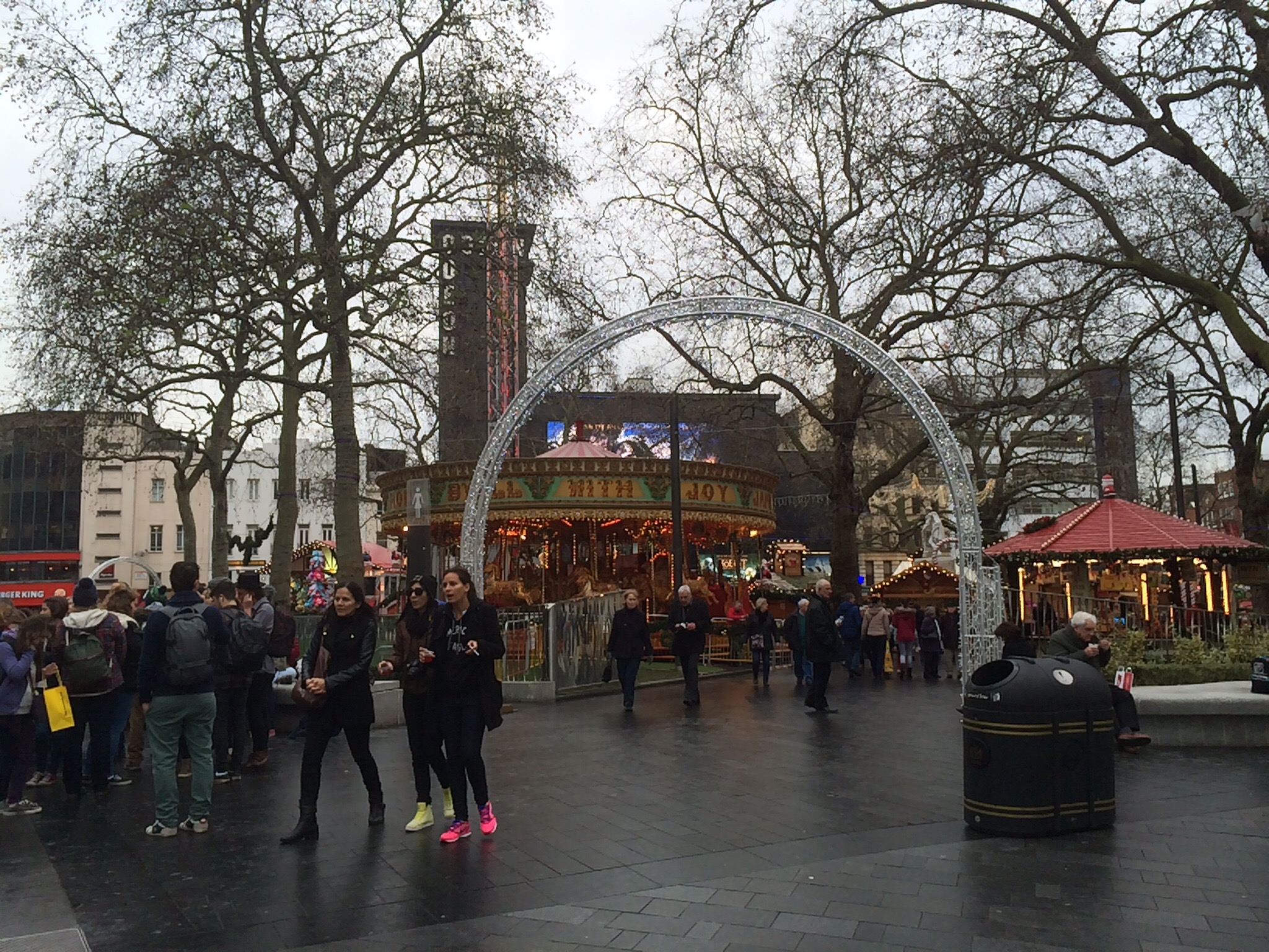Vidare till Leicester Square där ett helt hus blåsts ut, bara skalet var kvar och själva parken full med karuseller och annat inför helgen
