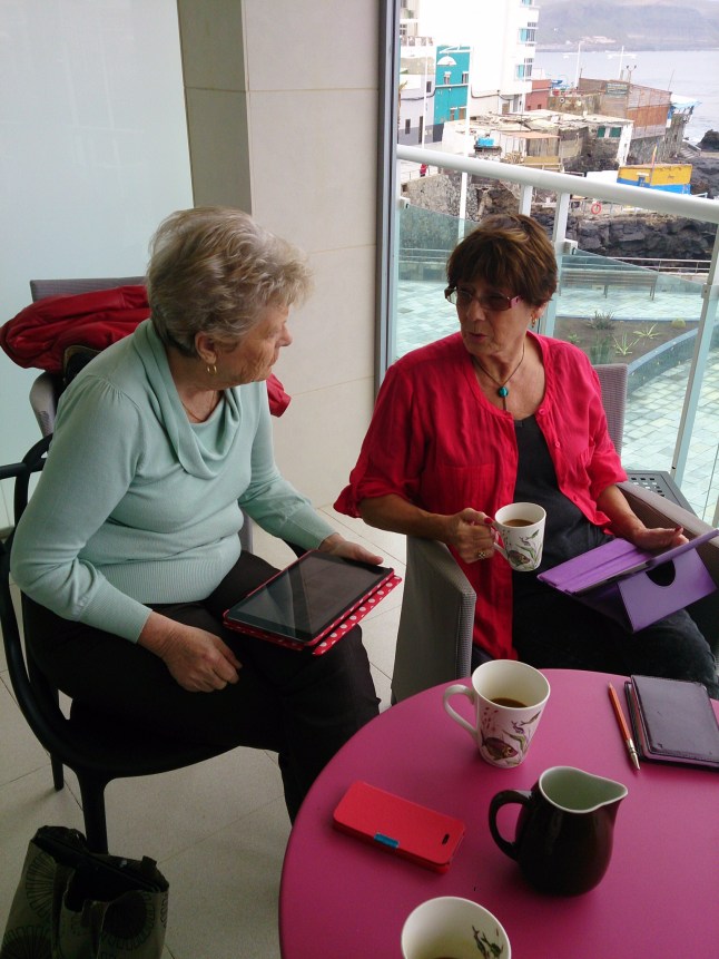 i går var vi hemma hos Eva och drack en kopp kaffe. Eva och jag var fullt upptagna med att få ordning på boklistan. Vi har alldeles för många böcker och skriver av de böcker som inte har lånats på länge. Vi satt ute på balkongen med havet som bakgrundsmusik.