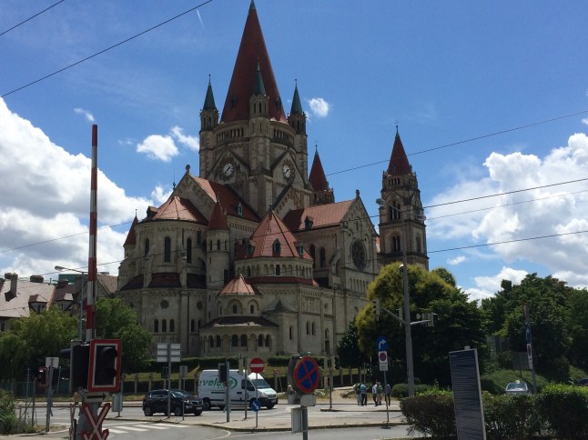 Vi gick av vid Reichsbrücke där vi såg denna vackra kyrka medan vi väntade på bussen som skulle ta oss till
