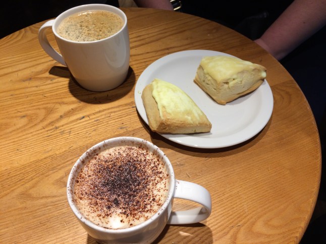 Vi startade med frukost på Starbucks med kaffe och lemonscones.