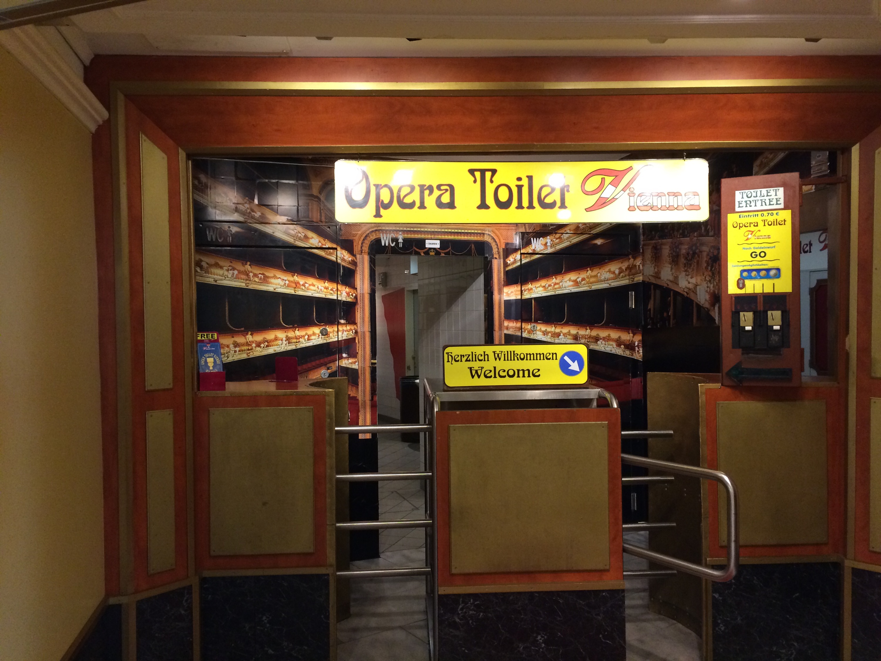 Den här toaletten hittar man i en tunnelbanestation nära operan och för 70 centimos kan man kissa till wienermusik.