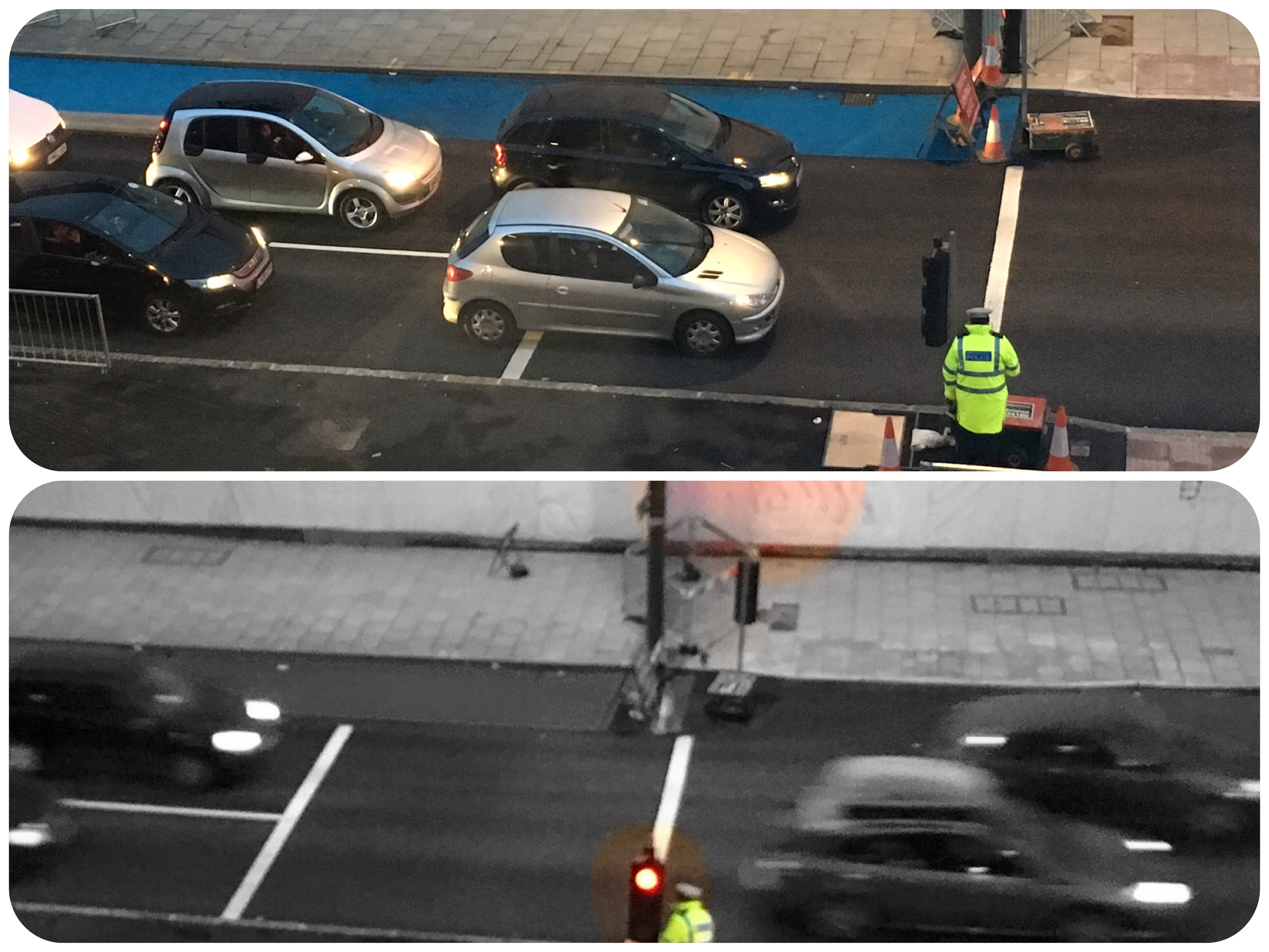Till slut kom en polisman, men han klarade inte av att stänga av ljuset så hans lösning blev att resolut vända på signalljusen. Så får det bli tills imorgon!