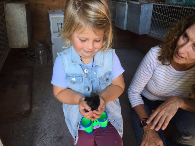 Daniela var lycklig för efter maten gick vi runt och tittade på alla djuren och hon fick mata en del och även hålla i en kanin och en nyfödd kyckling