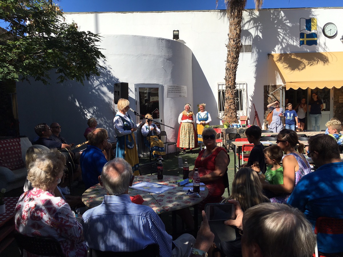 Som ju numera är Sveriges nationaldag firades i San Agustin på svenska skolans gård. Vår konsul, iklädd sveridräkten, höll ett jättefint tal, vi sjöng nationalsången och hurrade. Det serverades fika och smörgåstårta, men det smakade vi inte på eftersom vi var ett gäng som efteråt skulle ut och äta.
