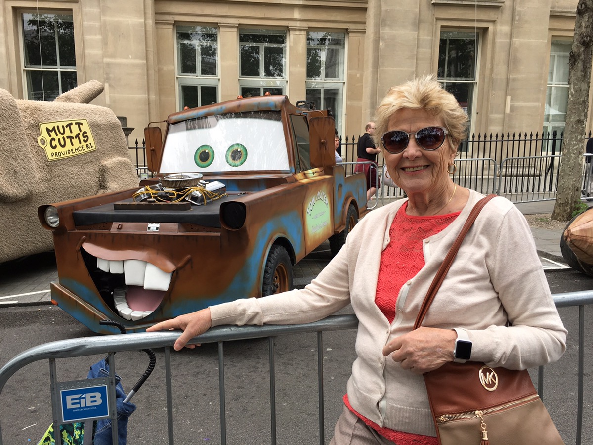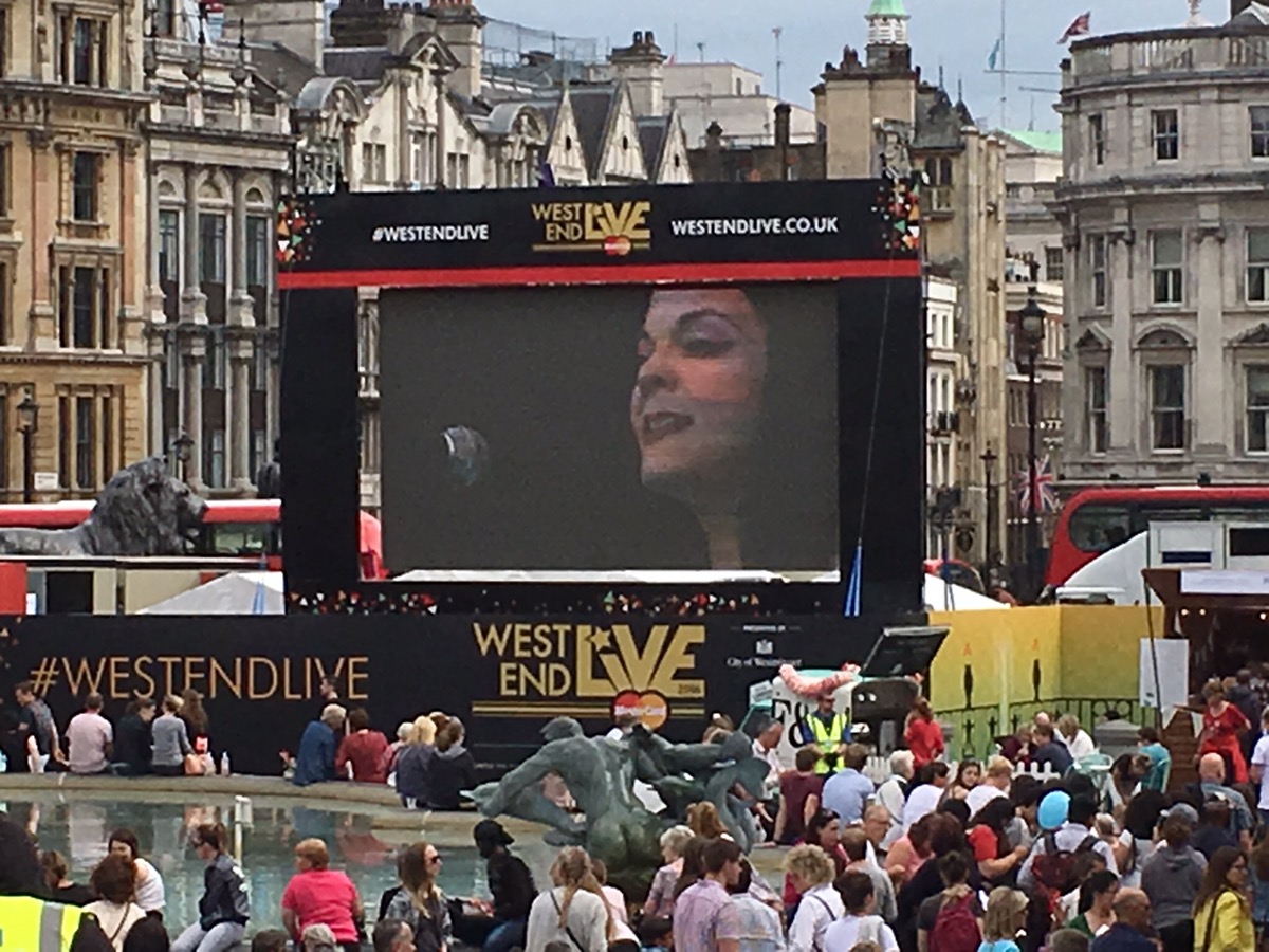 Därifrån fortsatte vi över CharringCrossbron till Trafalgar Square, där det var Westend live, vilket betyder att stjärnor från teatrarna i Westend uppträdde med aktuella sånger från sina musikaler. Det var omöjligt att komma nära scenen, men de hade som tur var satt upp flera storbildsskärmar. Vid sidan fanns flera bilar från kända TV-serier.