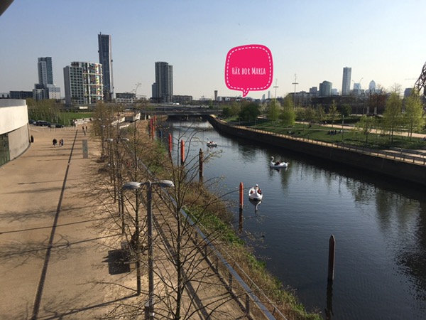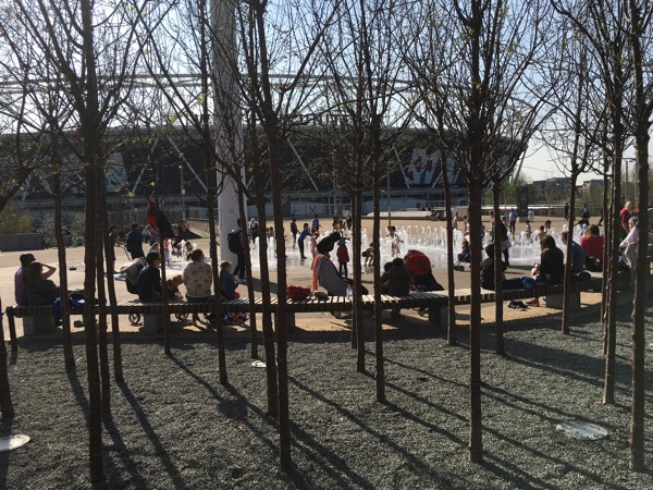 Hem gick jag genom Queen Elisabeths Olympic park. Ungarna hade jättekul där de sprang halvnakna genom vattenstrålarna.