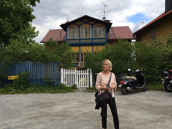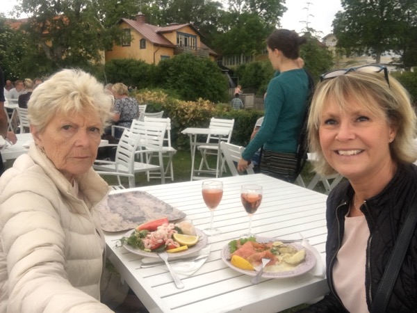 Vi gick runt en stund och tittade på alla de fina gamla husen innan det var dags för lunch på Waxholms Hembygdsgårds Café. Det komiska, eller sorgliga var att jag fick en kommentar från Marianne Elcar på FB att hon var där samtidigt, men att vi inte träffades. Eva åt lax med dillstuvad potatis och jag åt en underbar räksallad, nersköljt med ett glas rosévin. Tyvärr fick vi rusa inomhus innan vi ätit färdigt för det började regna.