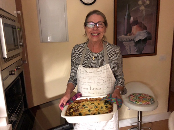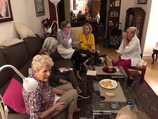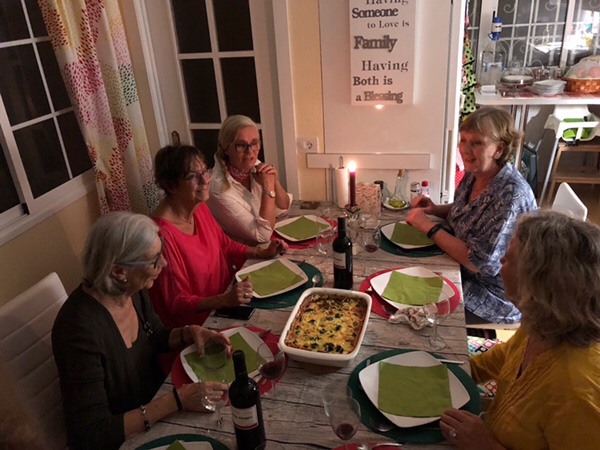 Och under tiden var farmor ute och roade sig! Jag samåkte med Ann ner till San Agustin där alla nya och gamla medarbetare var bjudna på middag i prästgården. ” i all enkelhet” hade Eva sagt, men jag vet inte vari enkelheten bestod för det var en helt underbar middag. Först en välkomstdrink medan vi samlades, därefter en förrätt med melon och skinka. Huvudrätten bestod av ugnsbakad lax med sallad och god sås och det hela avslutades med kaffe och en underbar nötkaka. Under efterrätten skulle alla bidraga med något minne från sin tid på kyrkan. En fantastiskt trevlig kväll.