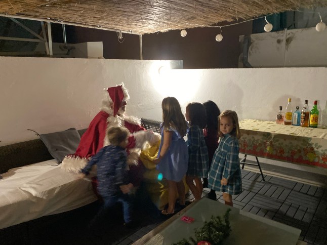 Efter maten gick vi upp på takterrassen dit tomten kom och delade ut lite julklappar.