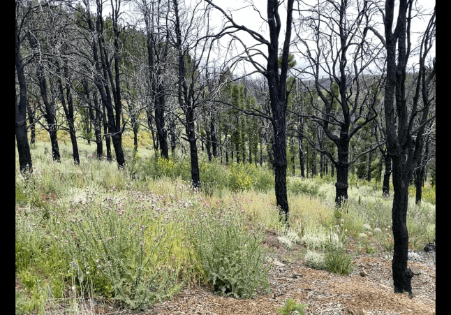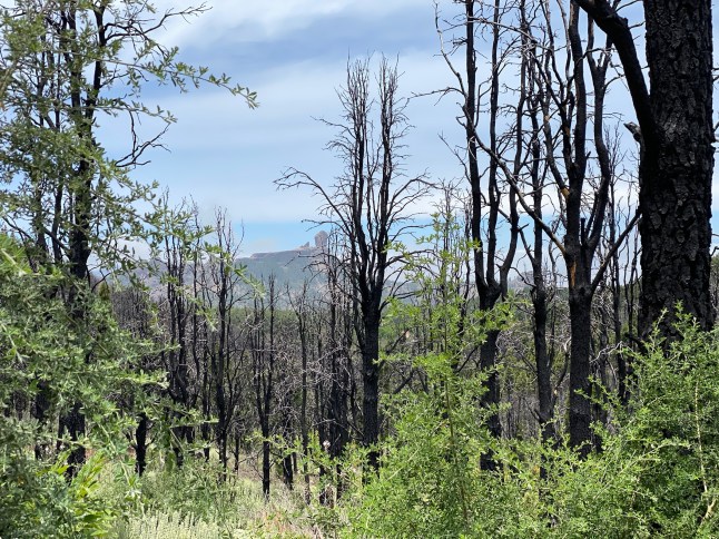 Igår packade vi in hela familjen i bilen och åkte upp i bergen. Underbart att komma ut i naturen och få andas frisk luft utan munskydd. Vad som mest fascinerade mig var kontrasten mellan liv och död. All grönska och vackra blommor blandat med döda träd efter senaste branden.