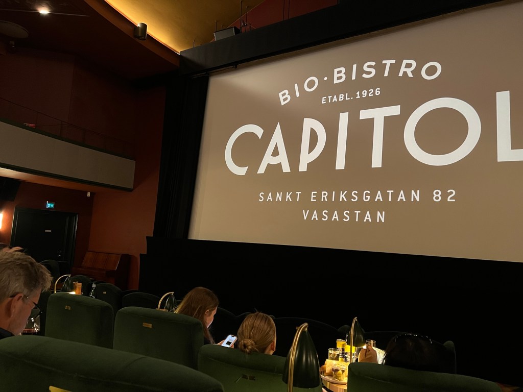 Idag gick Eva och jag på bio. Vi promenerade tidigt till Capitol där vi såg Där kräftorna sjunger. Filmen tyckte jag inte var någon höjdare, men biografen var en sevärdhet. Man kan äta där medan man ser filmen, men eftersom vi var så tidiga tog vi en liten rätt och ett glas vin i bistron i foajén istället.
