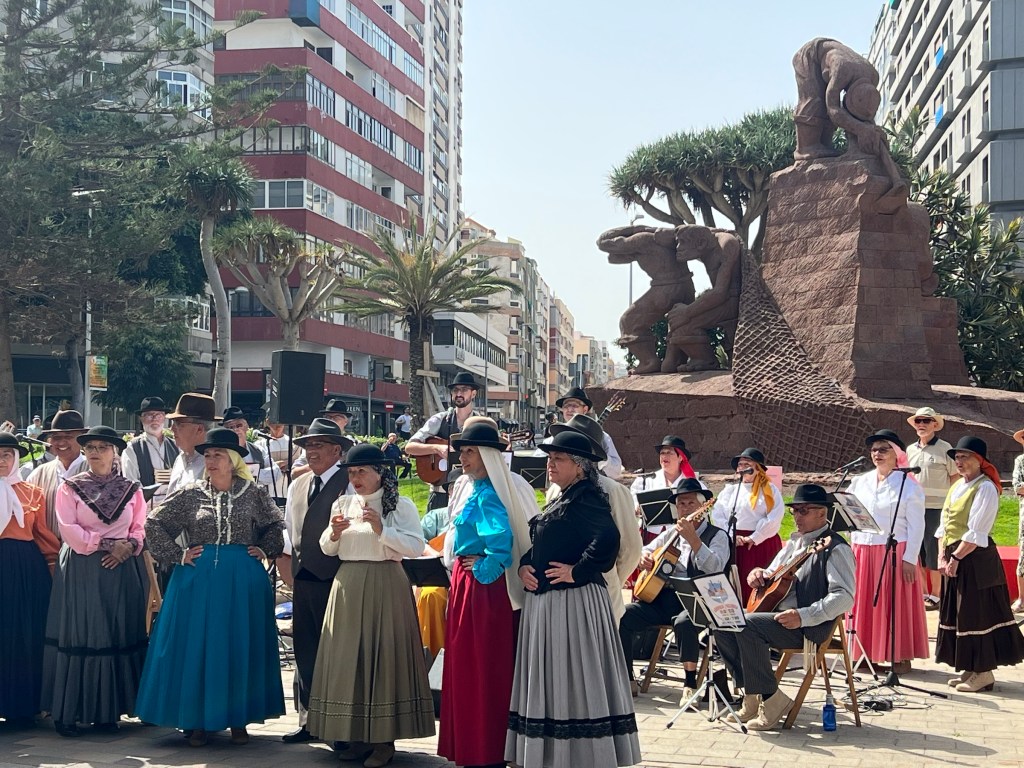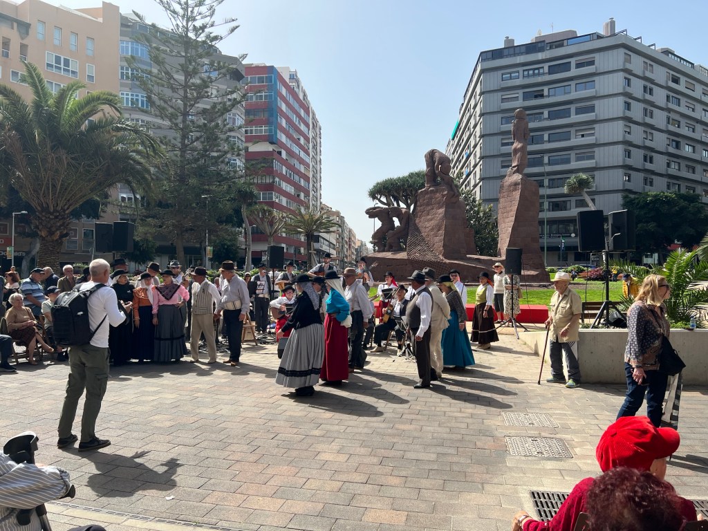 Dagen startade med kanarisk folkmusik och dans på plaza España. De hade nog tömt alla ålderdomshemmen och farbrorn på bilden ackompanjerade hela tiden orkestern med att spela på sin käpp. Lite senare åkte jag med familjen till Alisios där vi åt lunch och handlade liteDärifrån fortsatte vi till Arucas där det var mercadillo i parken.
