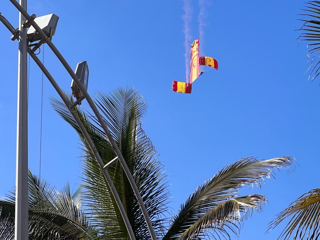 Uppvisningen började med fallskärmshoppare som landade på stranden framför hotell Reina Isabel.