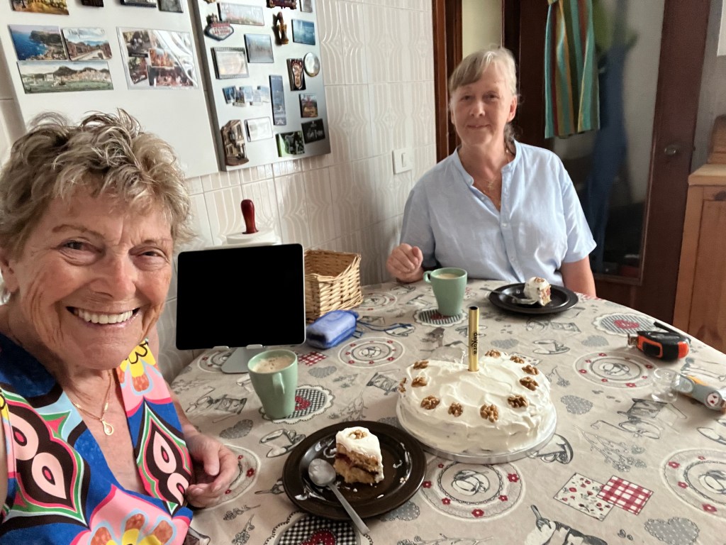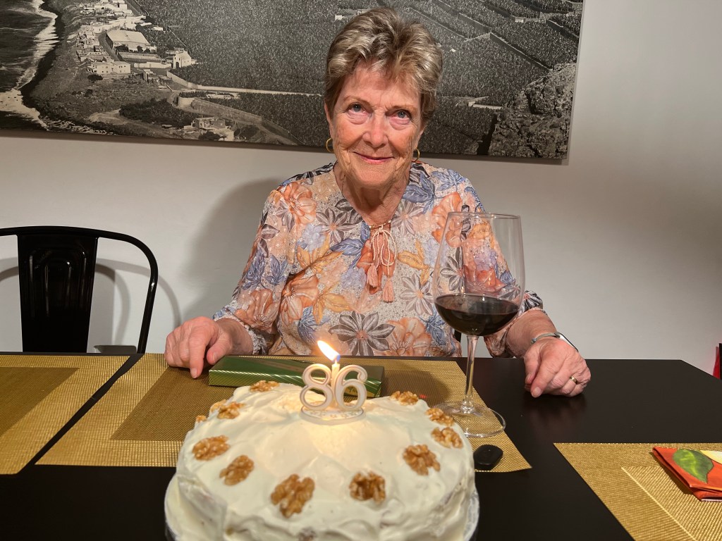 Jag stod i duschen när det knackade på dörren. På med badrocken i all hast, öppnade dörren och där stod Ria, som kom för att gratta mig med en hembakad tårta.