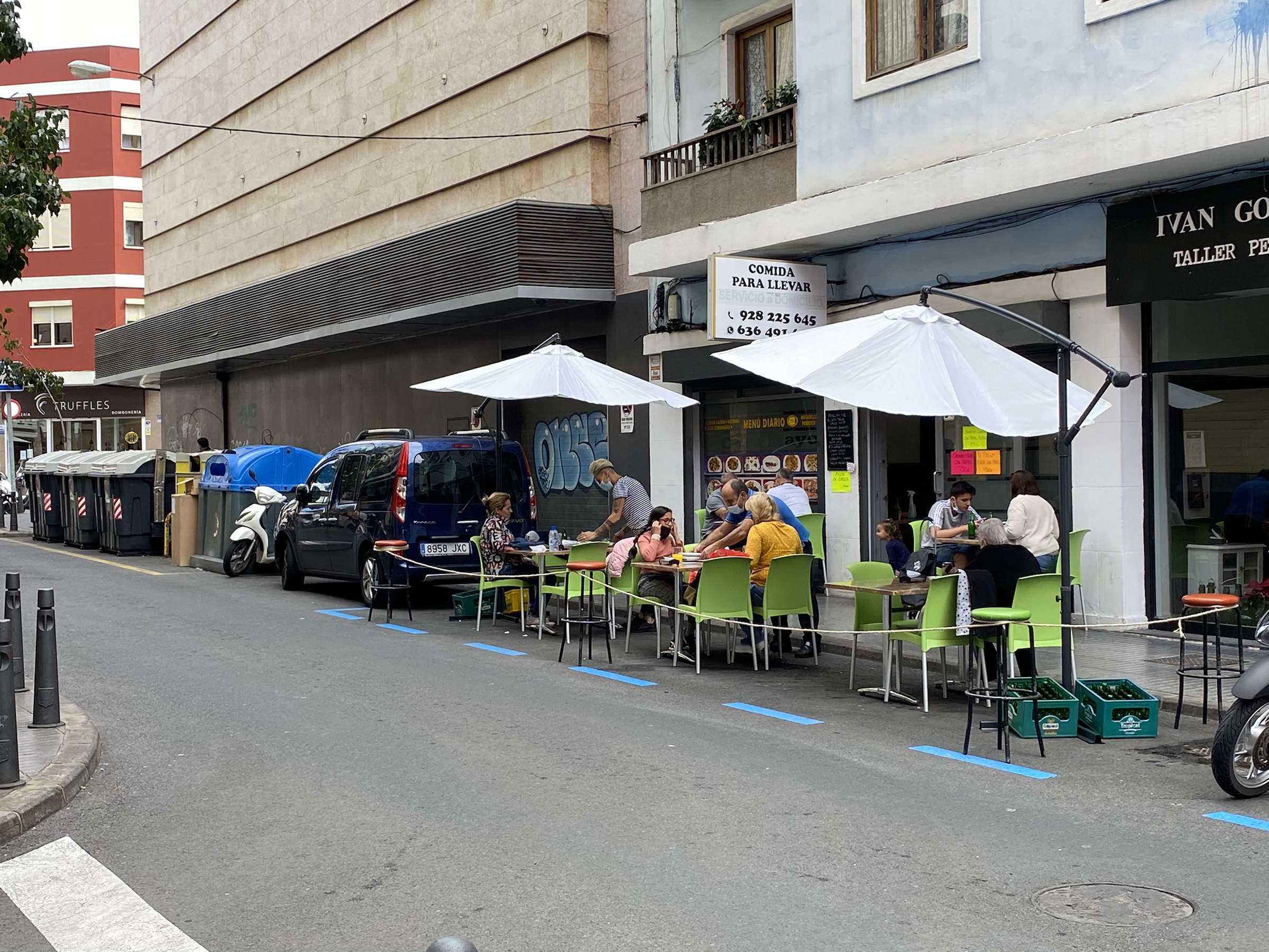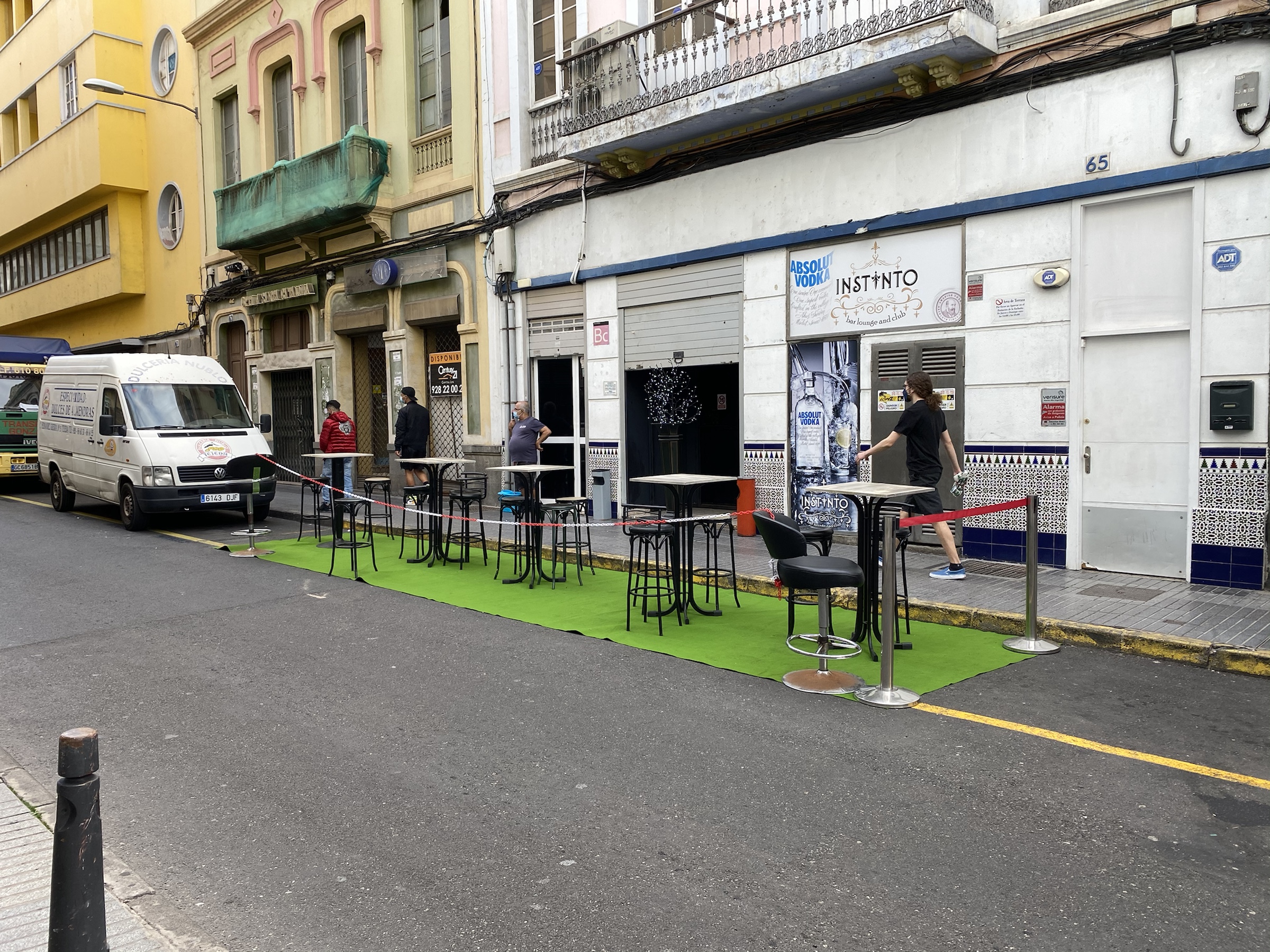 Eftersom vi är i fas tre får man inte sitta inomhus på restauranger och barer samt endast fyra vid varje bord, var det synd om alla småbarer som inte har någon uteplats. Men det löstes genom att använda trottoaren eller bilparkering.
