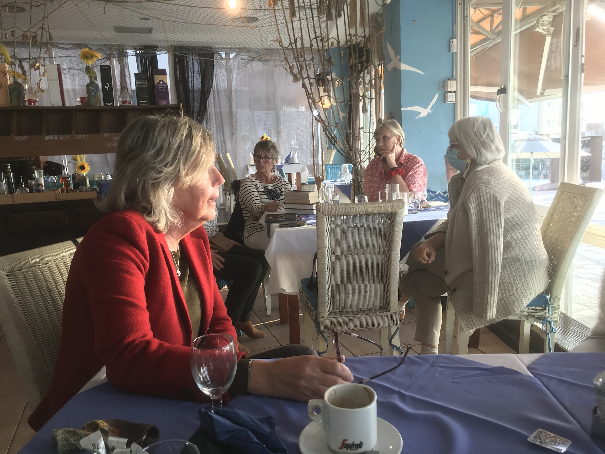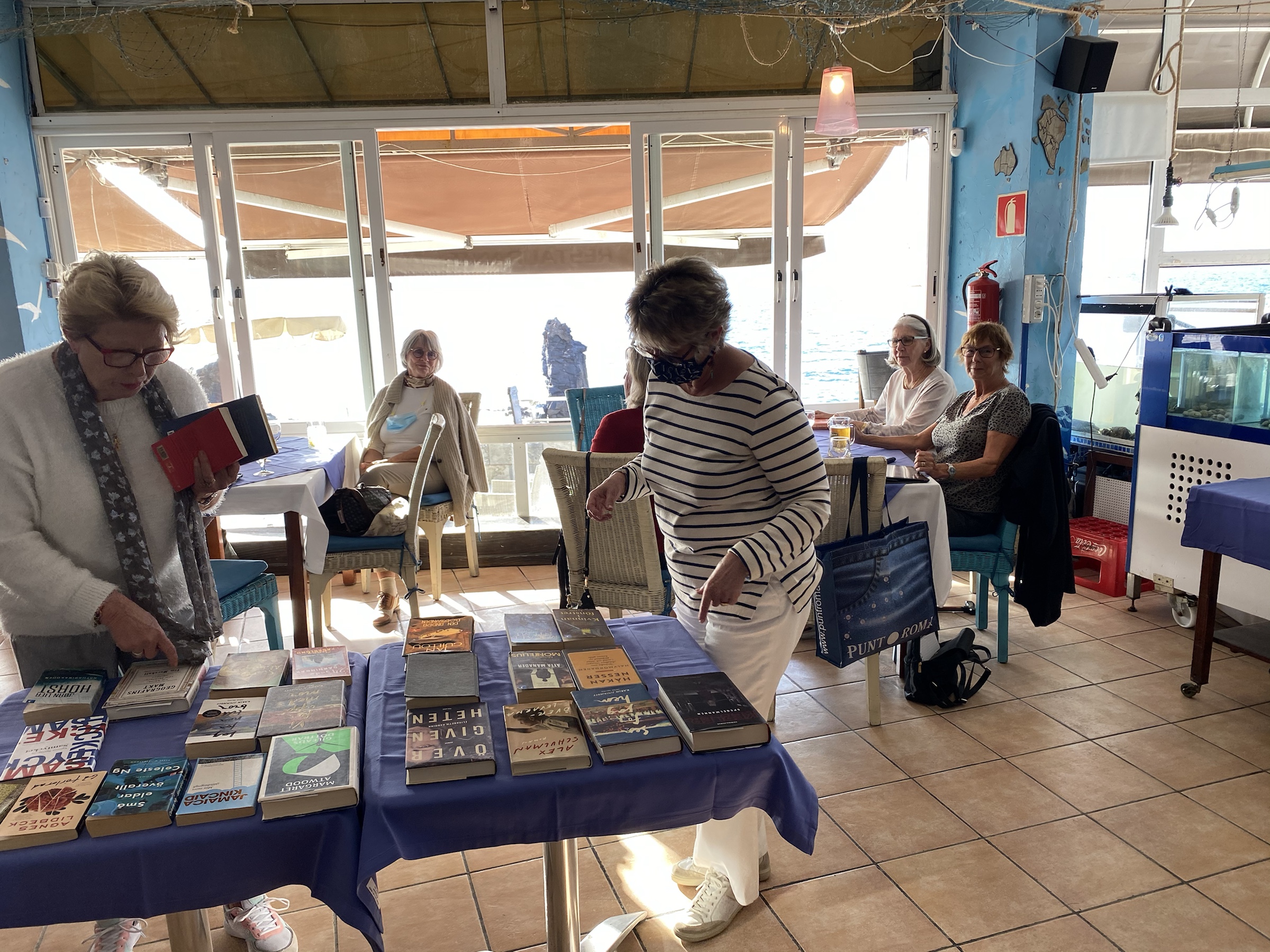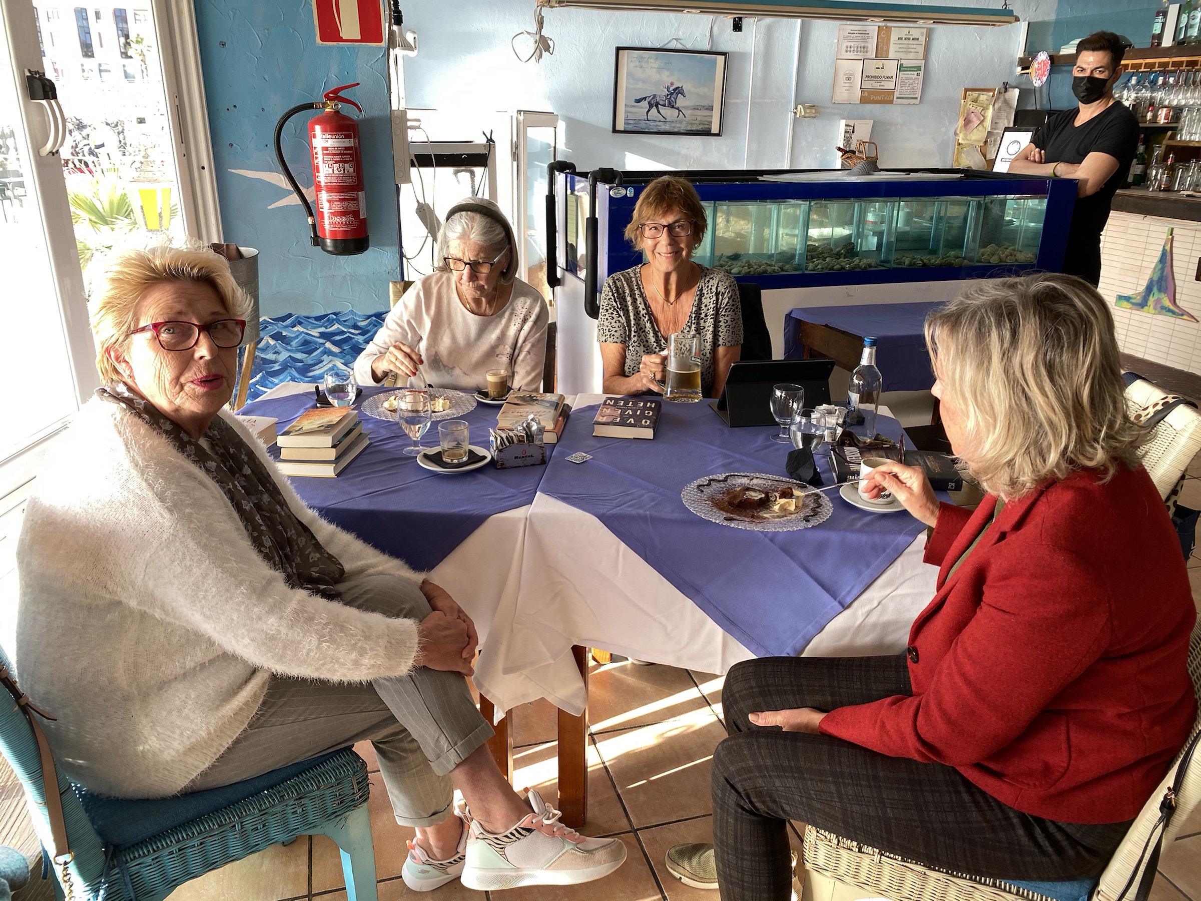 Denna gången samlades vi alla åtta på restaurang Clipper. Vi fick två bord bredvid varandra så vi satt fyra och fyra. Den snälle kypare kom med ett extrabord där vi kunde lägga våra böcker.